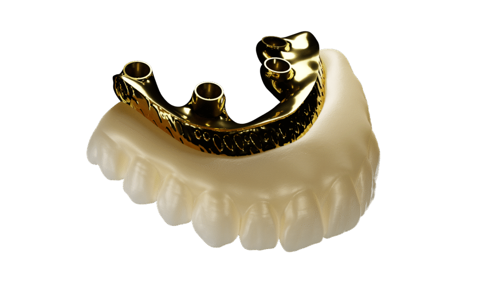El soporte metálico en la zona interna nos permite crear prótesis de zirconio con más pónticos de lo recomendado por el fabricante, optimizando tanto la resistencia como la estética. Gracias al uso de materiales más translúcidos, logramos resultados estéticos excepcionales sin necesidad de hacer grandes reducciones para la carga de cerámica.